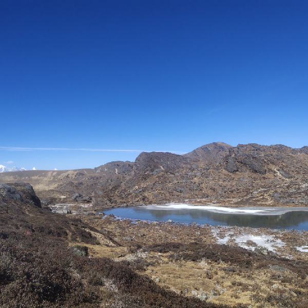 The trail skirts the western flank of Dharaso, leading to a saddle at 4,520 meters where you can pause to take in breathtaking Himalayan vistas. From this vantage point, around 4,460 meters in elevation, peaks such as Mount Everest (Nepal), Kanchenjunga (Sikkim), Jumolari, Jitchu Drakey, and Tseringma dominate the skyline.