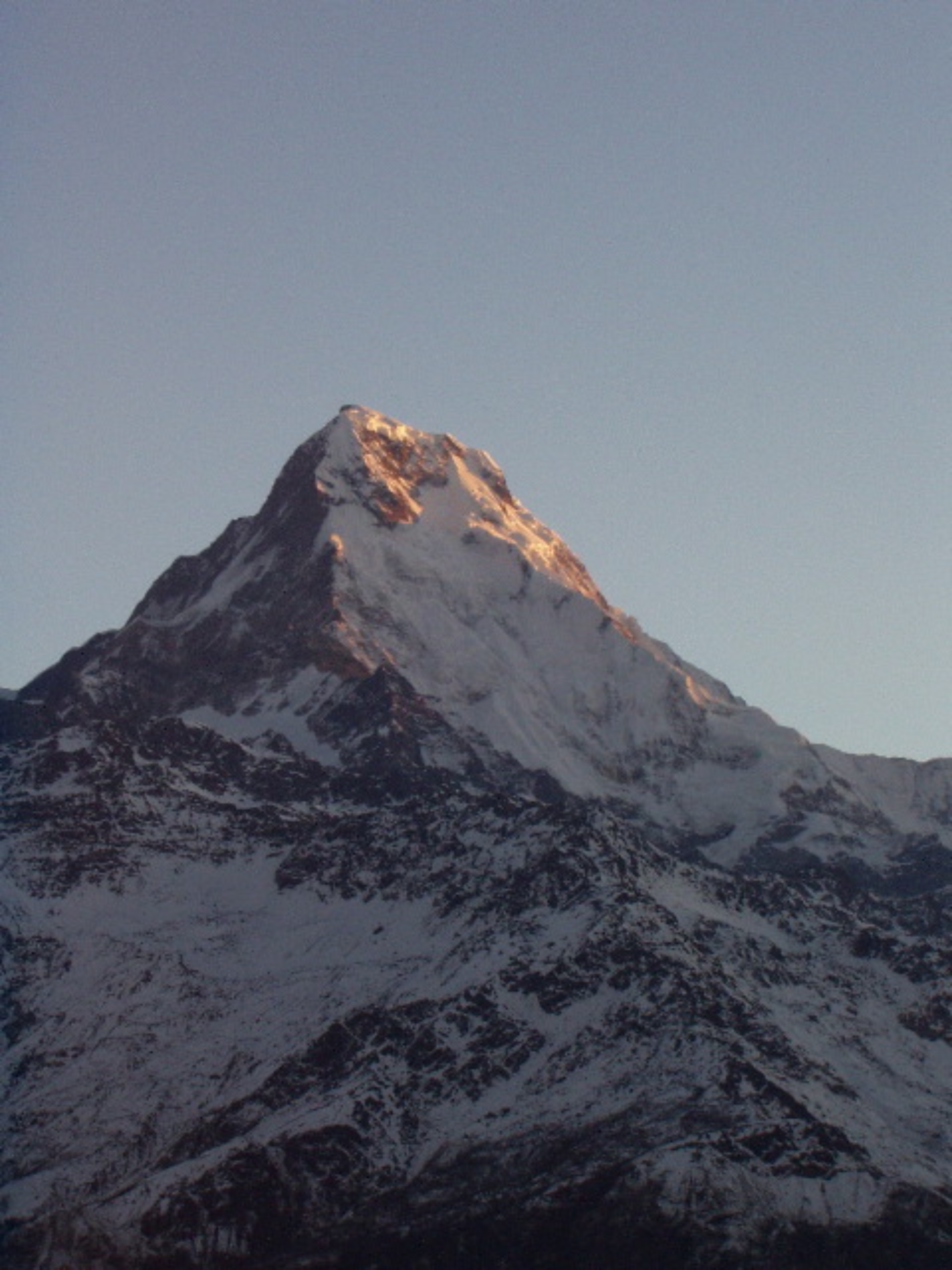 At Himalaya Hotel, we pause where the valley narrows like a cathedral nave. Then comes the final push - through avalanche-scarred landscapes where the air grows thin and the peaks suddenly dominate the skyline. Reaching Deurali's cluster of stone lodges at 3,230m, we're greeted with hot lemon tea and an impossible view: the sanctuary's icy walls glowing peach in the evening light, their glacier-carved faces whispering of the high places we'll walk tomorrow.