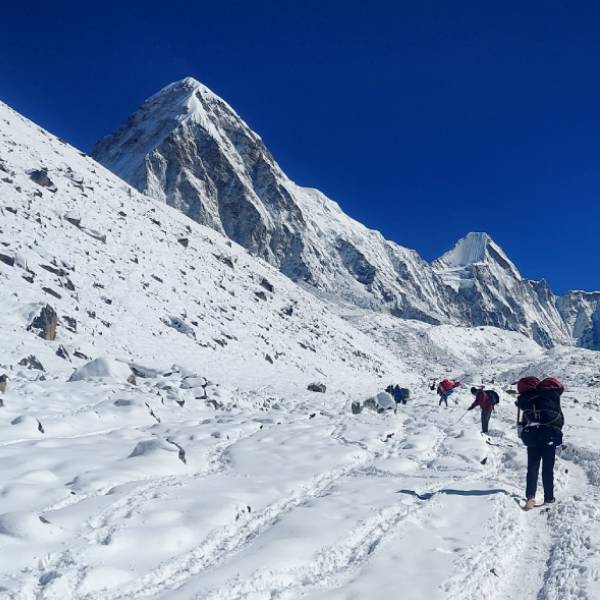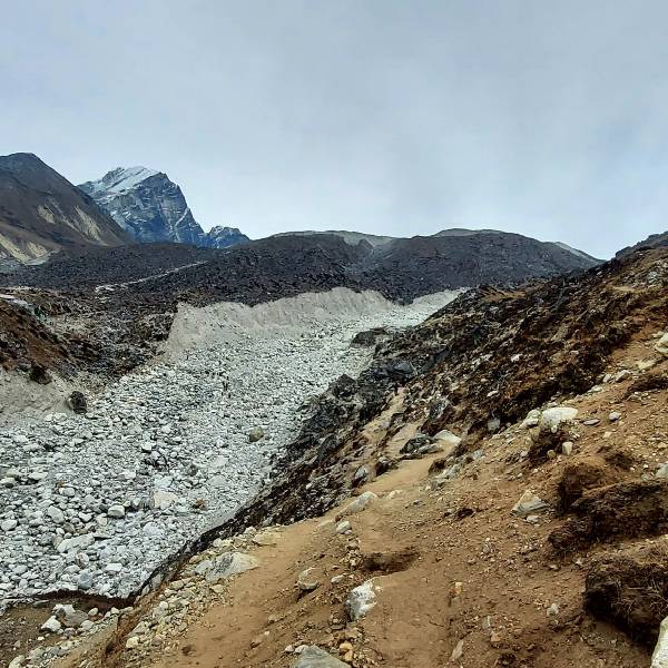 Traversing the glacier's rocky moraine, we're rewarded with breathtaking views of Khumbutse (6,636m), Lingtren (6,749m), and Pumori's (7,161m) icy flanks. The final stretch eases as we follow the valley to Lobuche, where the high-altitude settlement sits dramatically against a backdrop of the Mahalangur Himal range – a powerful reminder of our proximity to Everest's domain.